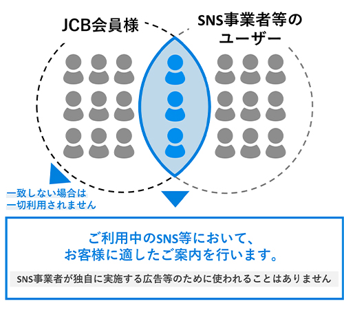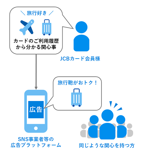 また、同じような関心を持つJCBカードをお持ちでない方に対しても、利用するSNS事業者等の機能をもとに、広告配信を行います。