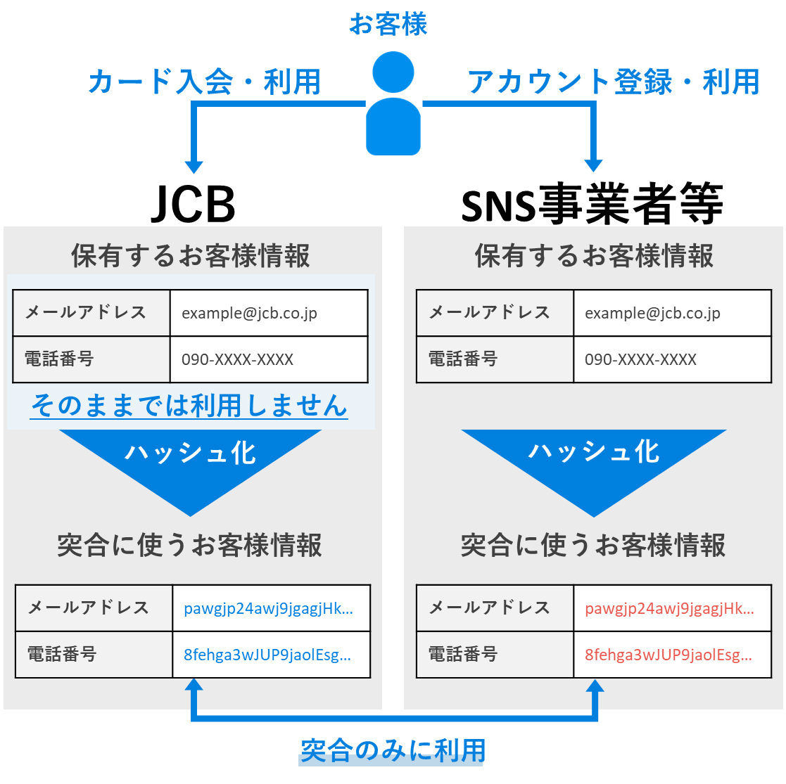 お客様からの届け出などによりSNS事業者等が保有しているデータとハッシュ化状態で突合します。
