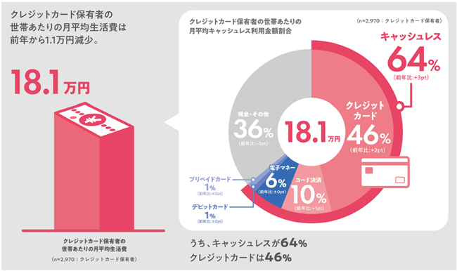 クレジットカード保有者の世帯あたりの月平均生活費18.1万円のうち、64%の金額をキャッシュレスで支払っており、前年より3pt.増加した。クレジットカードは46%と前年より2pt.増加。